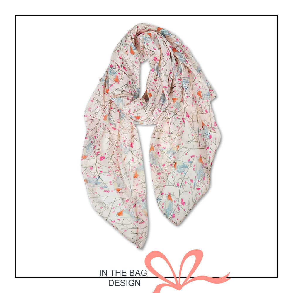 Introducing IN THE BAG DESIGN stunning beige scarf with a charming small bird print, perfect for nature lovers and fashion enthusiasts alike! This scarf is made with high-quality materials and is soft and comfortable, perfect for all-day wear.
